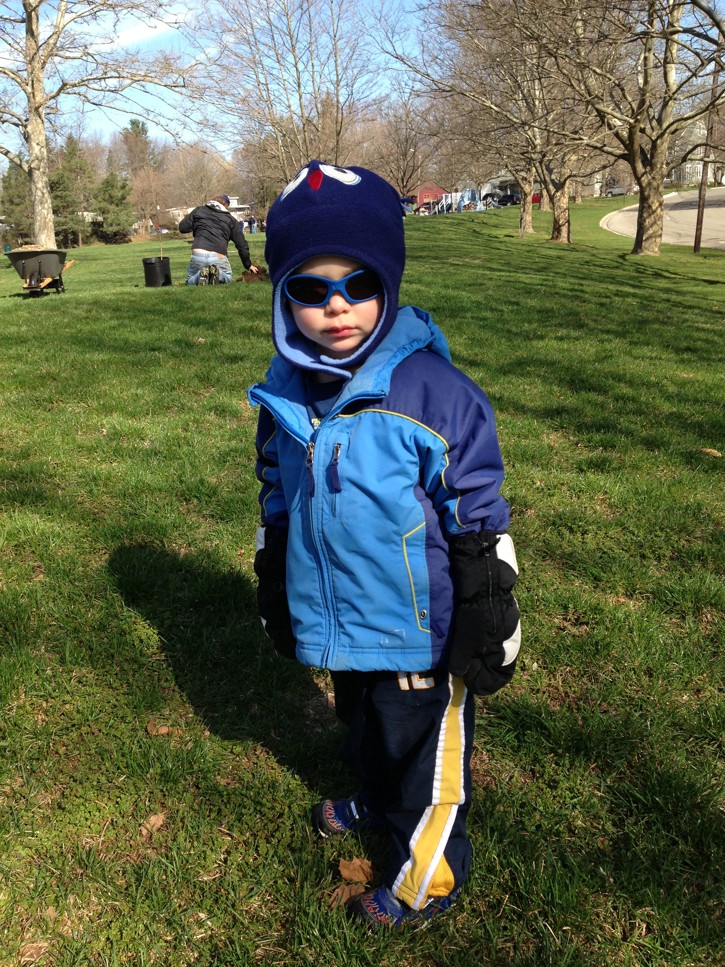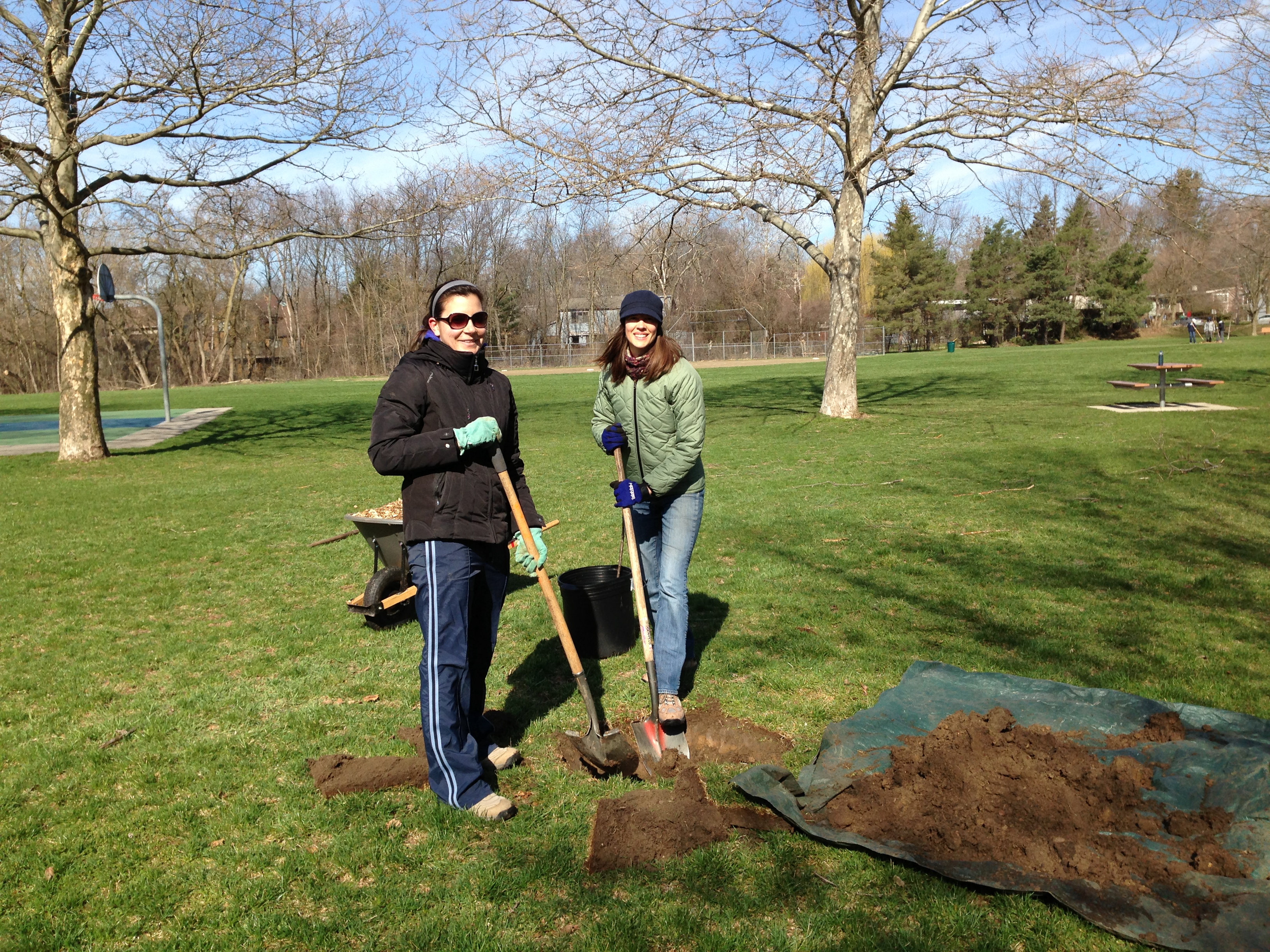 For our annual Earth Day project this year, 10 hardy Yoga Serves volunteers (plus a toddler and The Yoga Room’s mascot, Annie the dog) came out on a chilly but sunny Sunday morning to help out Ann Arbor Natural Area Preservation by planting some native fruit trees at Virginia Park and doing some general clean-up. We were told that our pear and apricot trees should start producing fruit in the next 2-5 years, so we look forward to checking back then to see if we can enjoy a tasty snack! Thanks Anne, Steve, Jerry, Colette, Colin, Lisa, Mallory, Linda and Bill for all your hard work! Mike Levine of Nature & Nurture donated the trees, and he said that this had been a dream of his to plant them in his neighborhood park. We’re happy we could help that dream come true!