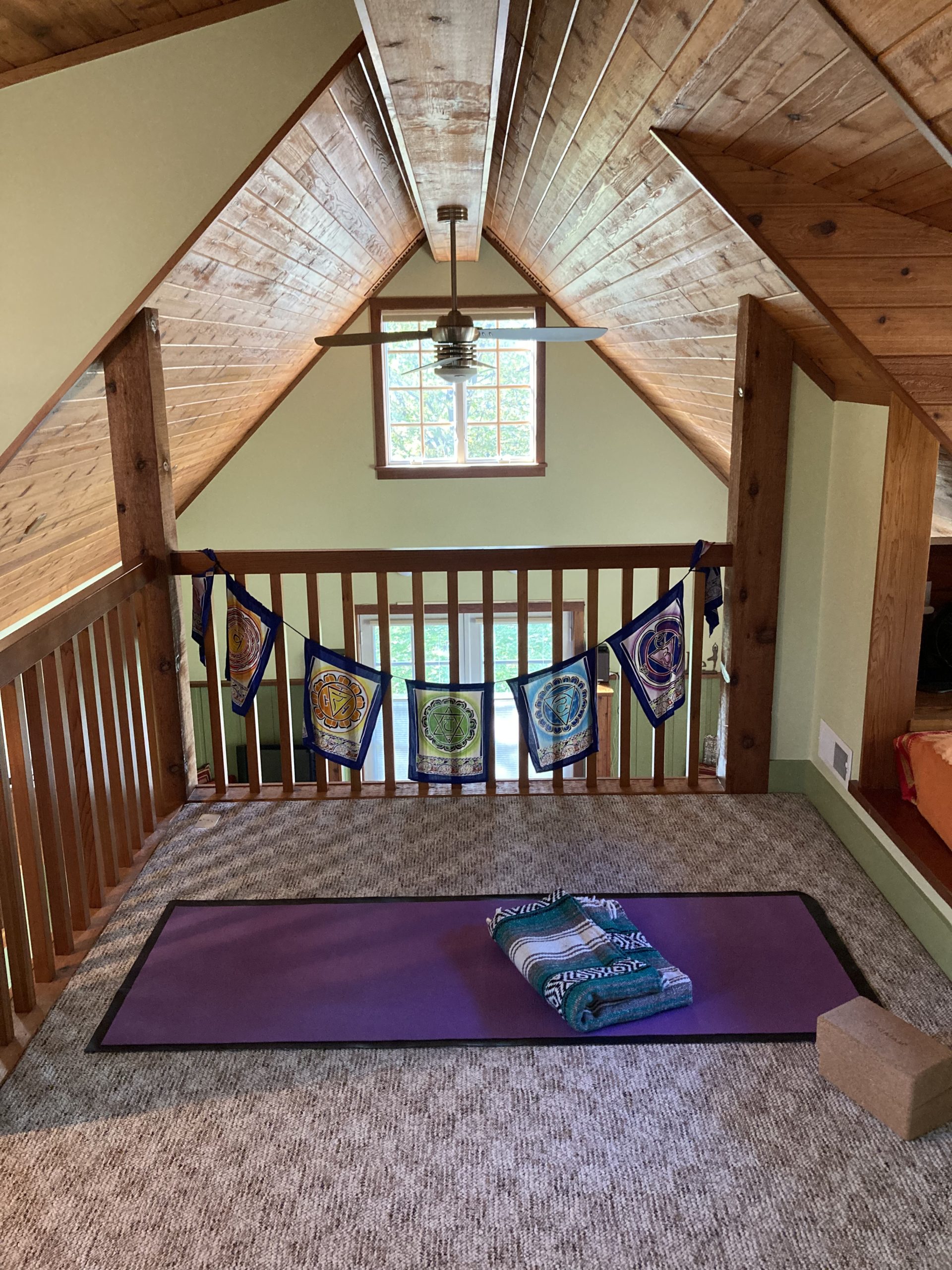 During your Personal Retreat you can practice yoga (I recommend with one of my audio sessions, or inquire about adding on a private yoga session with me), meditate, journal, read, spend time in contemplation or even take a nap. The main yoga studio with cork floor is available to you, as well as the carpeted loft space, which includes a comfy reading chair and small desk. See pictures below.